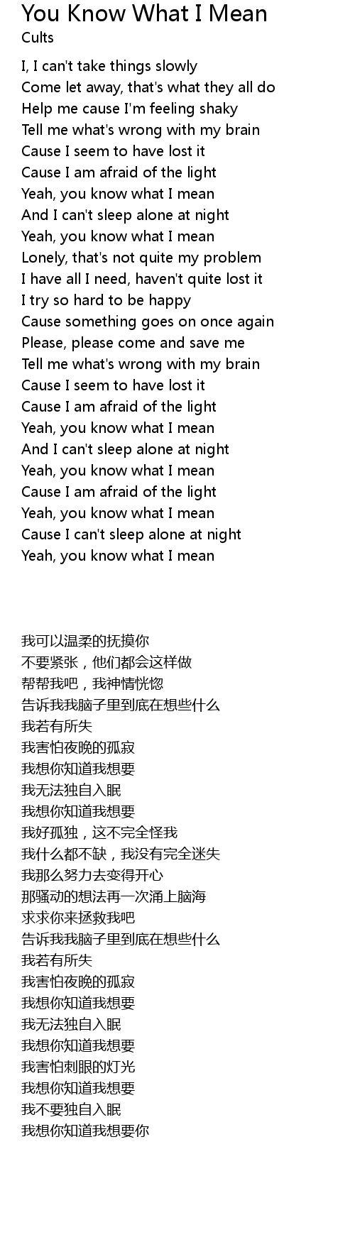 (I see what you mean) If you had a girl like mine, you'd know what I mean She likes to be around me;Police on the scene, know what I mean?Synonyms for You Know What I Mean (other words and phrases for You Know What I Mean)